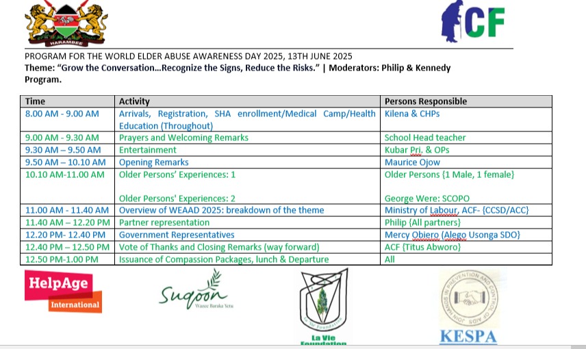 World Elder Abuse Awareness Day (WEAAD) is an annual commemoration for ACF under the care and support program. It creates an opportunity for awareness on elder abuse in all its forms, including financial, physical, emotional and neglect. This is marked at the community and county levels through ACF’s Older Person Associations (OPAs), at the national level in collaboration with the Ministry of Labour and Social Protection (MoL& SP) and regional/global levels through social media and online advocacy. This year’s Theme is: “Grow the Conversation…Recognize the Signs, Reduce the Risks.”